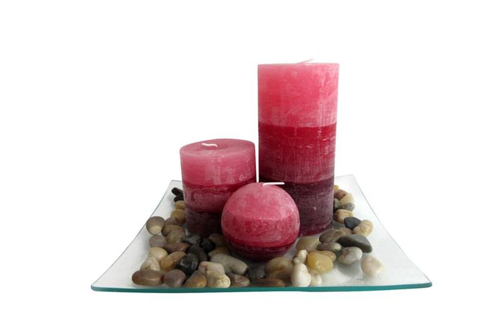 Dárkový set 3 ks svíček na skleněném podstavci a kamínky je vhodný nejen jako dárek, ale i k dekoraci a zpříjemnění chvil strávených doma. Nezapomeňte prosím dbát na bezpečnost Vašeho domova a držte se na svíčce uvedených bezpečnostních piktogramů. Dárková sada obsahuje: podnos 20,5 x 20,5 x 1,5 cm svíčka kulatá 6 x 6 cm svíčka střední 6,8 x 7,4 cmsvíčka velká 6,9 x 12,1 cmkameny. Materiál: parafín. Vůně skořice. Dárkový set 3 svíčky s vůní skořice na skleněném podnosu s kameny.