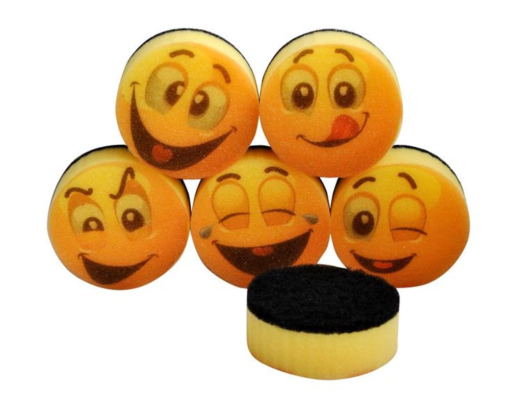 Houbička na nádobí má velmi účinou pevnou brusnou vrstvu odolnou proti opotřebení. Kulatá - veselý potisk smajlíků. Balení obsahuje 6 ks ve žluto-černé barvě. Rozměry - 7,9 x 3 cm.