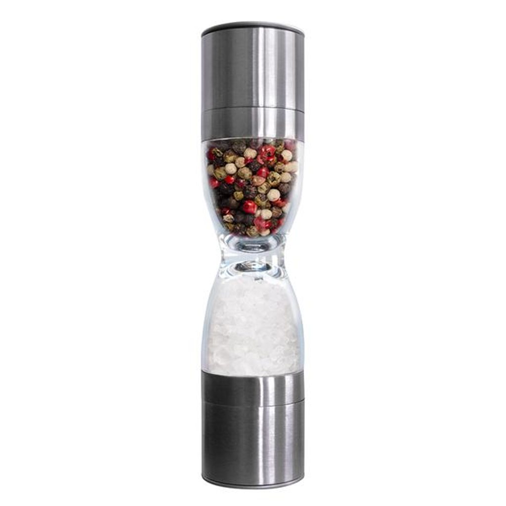 Ruční mlýnek na sůl/pepř ve tvaru přesýpacích hodin. Sůl a pepř se mele zvlášť na protilehlých stranách. Obě strany mají krytky proti sypání namletého obsahu. Materiál - nerez. Rozměry - 5,2 x 22 cm.