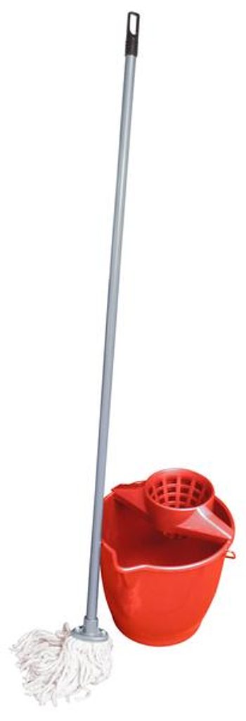 Úklidový komplet sestávající z kulatého kbelíku (objem 10 ltr) se ždímačem a bavlněným mopem s tyčí 120 cm. Umožňuje snadnější a hygieničtější úklid všech druhů podlah. Materiál - plast, mop-bavlna. Rozměry - 27 x 26 cm. Barva šedá, modrá.