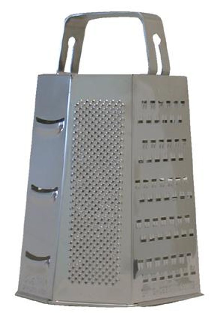 Šestihranné struhadlo se základními funkcemi strouhání a pevným držadlem. Lze strouhat na jemno, na hrubo a na plátky. Materiál - nerez. Rozměry - 9,5 x 22 cm.