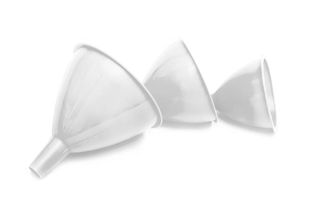 Plastový trychtýř slouží k přelévání tekutin do úzkých lahví. Díky výstupkům na boku se dá pověsit na závěsnou tyč. Sada 3 ks. Barva bílá. Průměr 10, 7 a 5 cm.