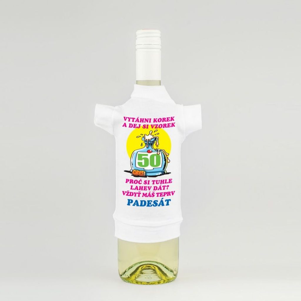 Žertovné tričko na láhev vína, které pobaví oslavence 50. narozenin. Darujte originální a vtipný dárek oslavenci k jeho půlstoletí.