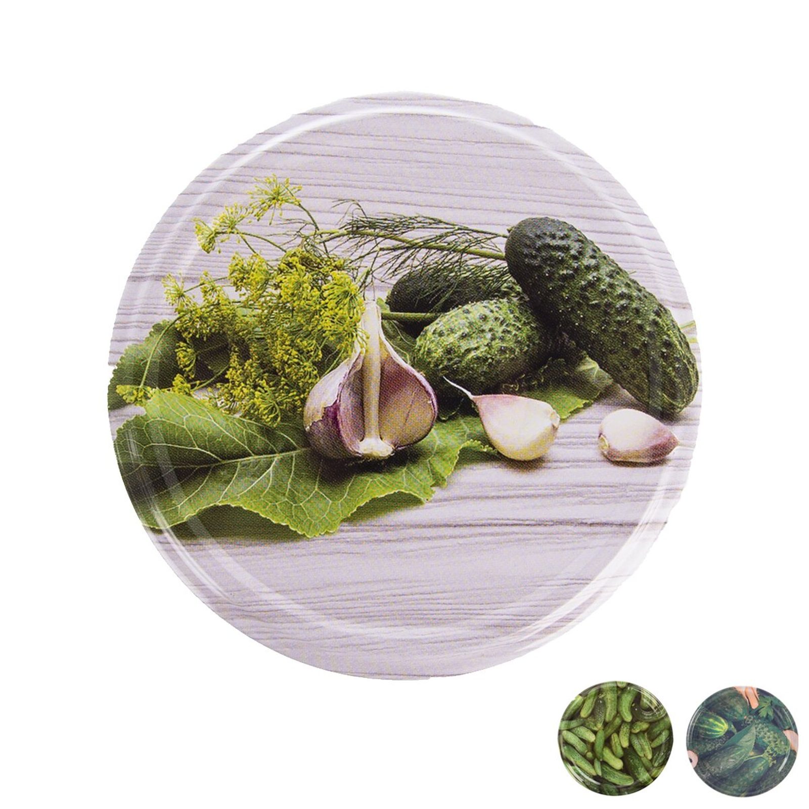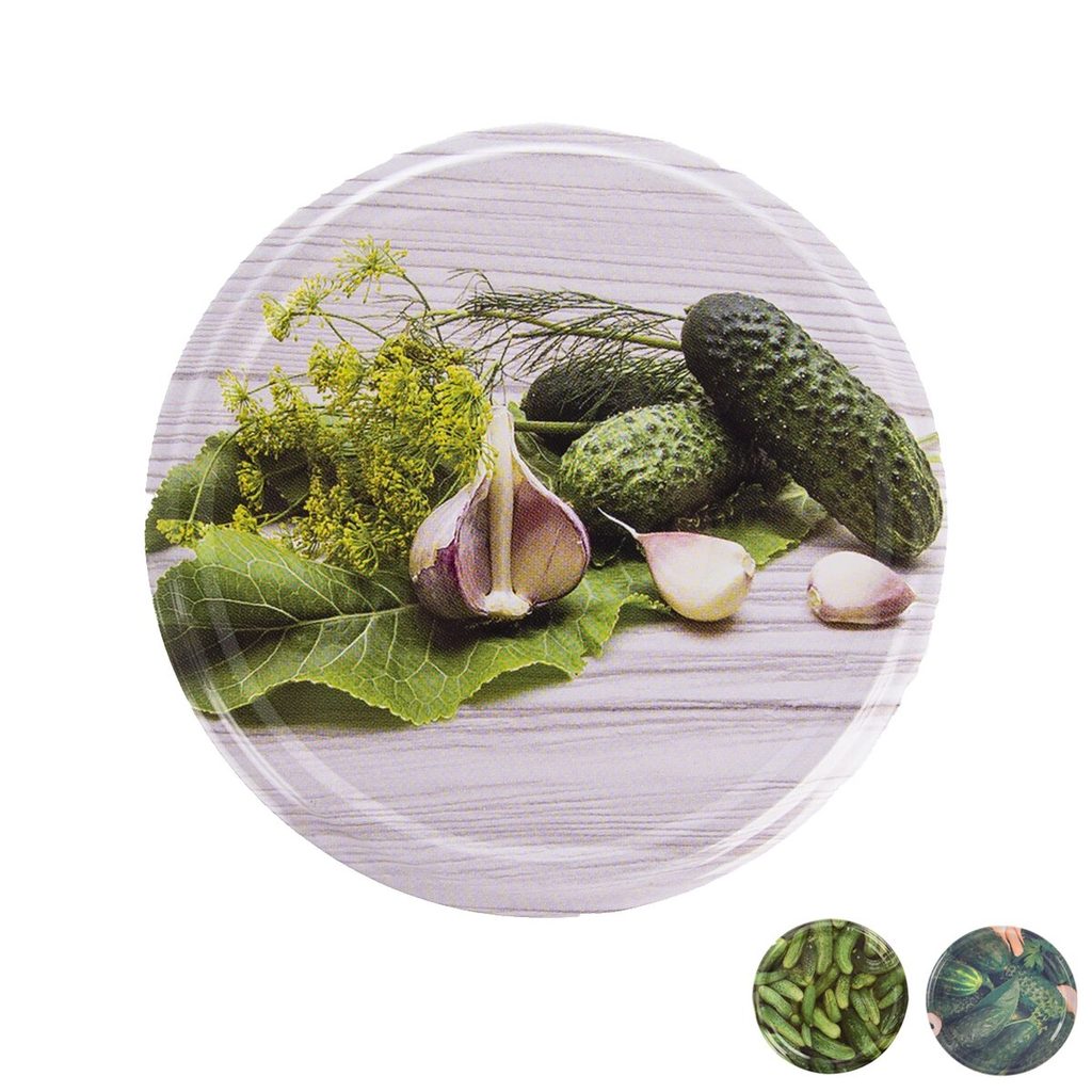 Víčko na zavařovací sklenici s dekorem, se závitem. Materiál: kov. Rozměry: pr. 8,5 cm.